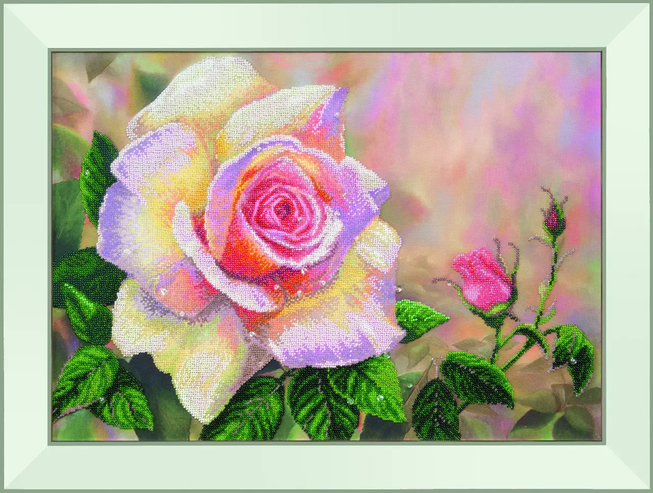 The kit contains: color pattern, instruction chart, printed embroidery cloth, Preciosa beads and needles.