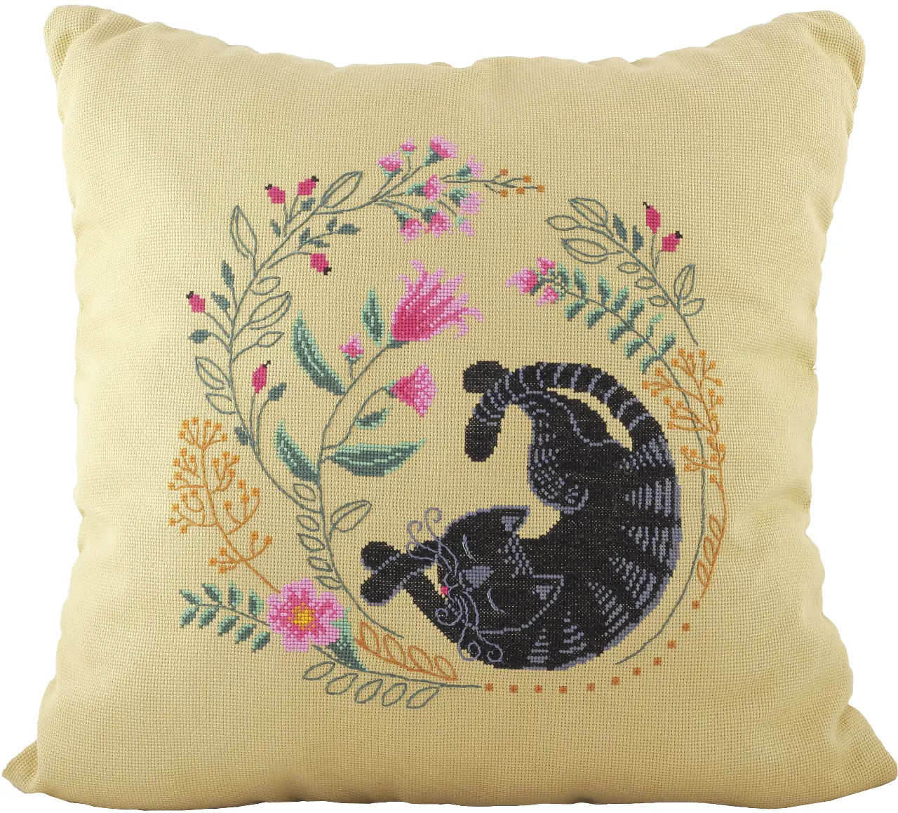 The work is stitched by cross stitch, backstitch and feather stitch.