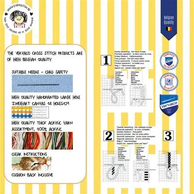 Vervaco products are characterized by high Belgian quality. The set includes high-quality materials: hand-painted canvas with large holes with 100% cotton (count: 18 /10 cm - 4.5 stitches), thick yarn 100% acrylic, clear working instructions, a needle. A large full-color image of the finished model and a color scheme. Stitches: cross, Number of colors: 5, Difficulty: Very easy.